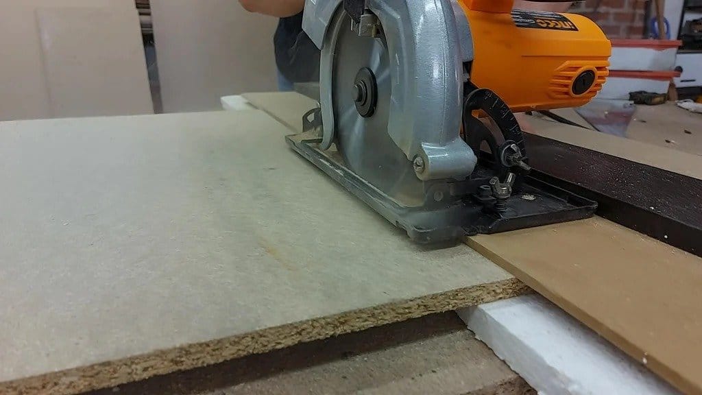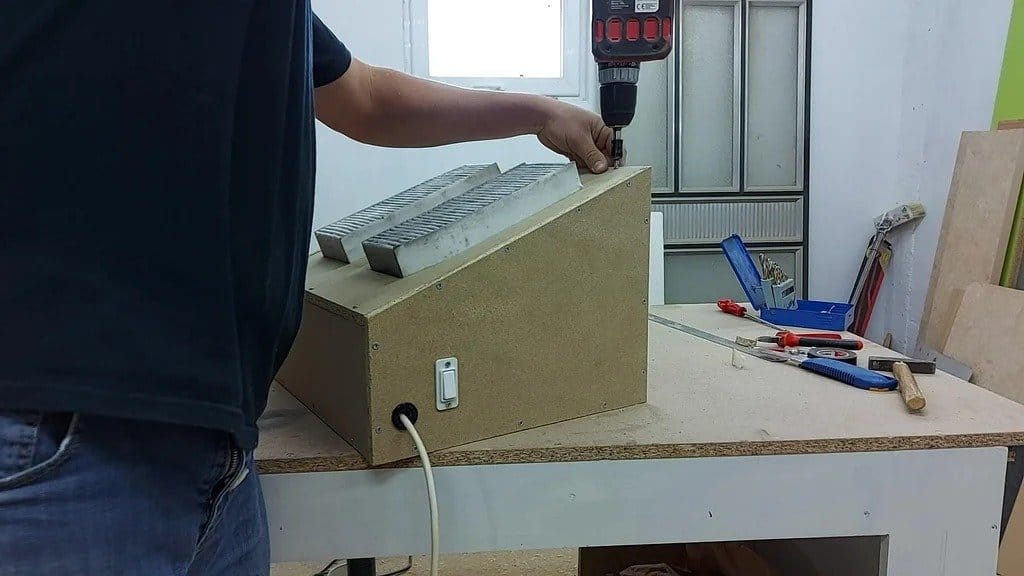 Сам мотор и труба воздуходувки будут установлены в ящик из ДВП. Сначала мастер произвел замеры узлов воздуходувки и учитывая их размеры разметил и распилил детали для ящика.