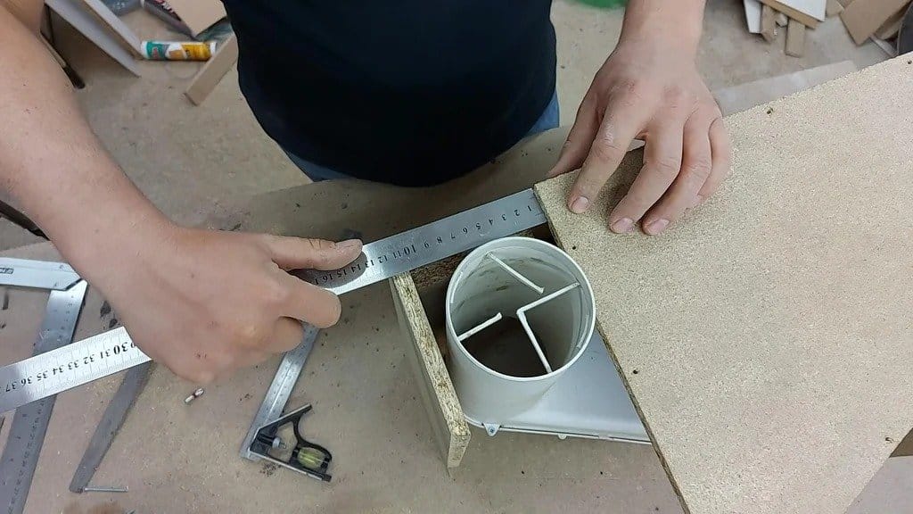 В боковой стенке вырезает отверстие по диаметру пластиковой трубы. Прикручивает стенку к каркасу.