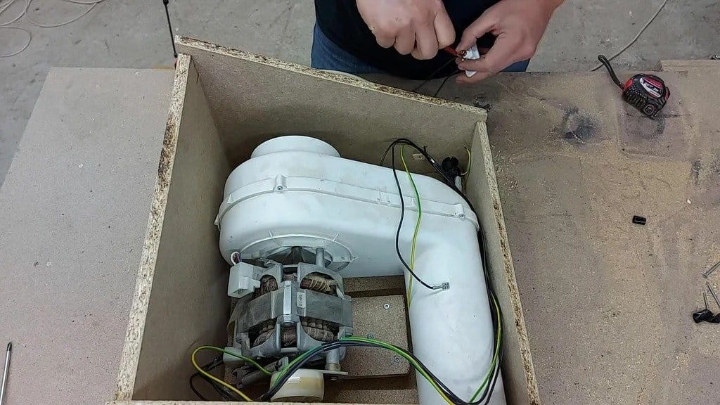 Питается двигатель от бытовой сети. В боковой стенке ящика мастер вырезает отверстие и устанавливает выключатель. Во второе отверстие протягивает провод питания. Подключает провод к мотору через выключатель.